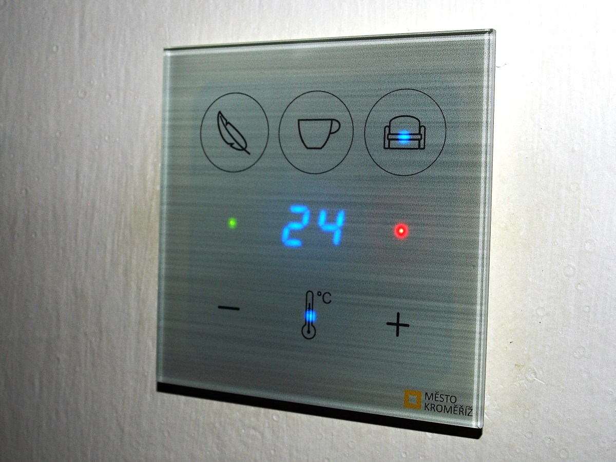 Výraznou novinkou v tomto řešení je vůbec první použití sběrnicových skleněných dotykových termostatů s LCD displejem, jejichž vzhled byl navržen na základě představ a zadání provozovatele objektu, včetně jeho loga.