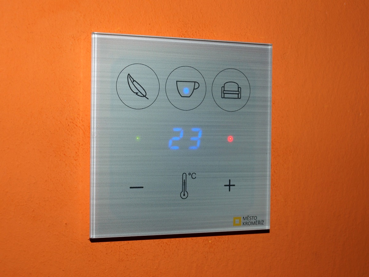 Nový termostat přináší jednoduché ovládání prostřednictvím 6-ti dotykových ploch, které je podpořeno indikací provozních stavů pomocí různobarevných LED a displeje, který zobrazuje jak naměřenou, tak i požadovanou teplotu. V tomto objektu se nachází 89 regulovaných místností, z toho je 80 místností osazeno tímto novým dotykovým ovládacím prvkem. Celkově je regulováno 119 elektro-termohlavic. Zónová regulace je provázána s vlastní regulací plynové kotelny s několika topnými okruhy.