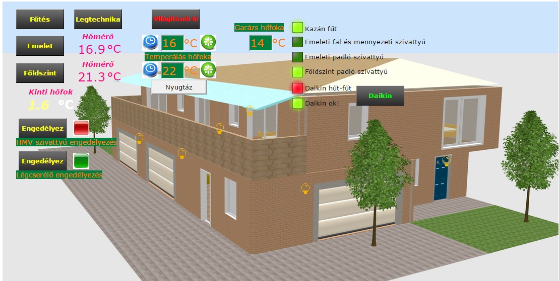 Tepelné čerpadlo Daikin Altherma, instalované v obou budovách, prudukuje vodu pro chlazení a vytápění. Majitel má přes Foxtrot plnou kontrolu tohoto procesu včetně monitoringu všech stavů. Současně si může nastavovat teplotu jednotlivých místností a časové diagramy, což vidíme i na obrázcích níže. V poslední fázi proběhl monitoring osvětlení na floorplánu ovládací obrazovky a ovládání žaluzií.