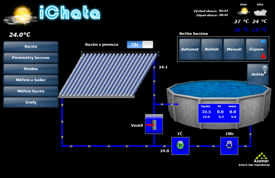 Byl jsem požádán, abych vytvořil automatické ovládání a řízení venkovního bazénu na jedné nejmenované chatě u Brna. Pro ohřev je použito stávající tepelné čerpadlo a solární termický panel na střeše chaty. Uživatel si pouze vybere požadovaný režim bazénu a o vše se již postará automatika, která si sama zvolí nevhodnější zdroj ohřevu a podle potřeby i mezi nimi přepíná elektrickým ventilem. V projektu je použita nová knihovna pro ukládání měřených dat a jejich zobrazení. Poprvé byla navržena funkce pro spouštění filtrace pouze podle požadované doby běhu filtrace. Kdy a jak dlouho bude filtrace běžet si již systém nastaví sám.