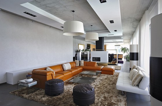 Společný obývací prostor má vzhledem ke své velkorysé ploše výšku stropu 3,20 m. Šedý pohledový beton se jemně snoubí s bělostnými sádrokartonovými podhledy, v nichž je integrováno osvětlení, a přírodními strukturami – kůží, dřevem, textilem, vlasovými koberci. Citlivá kombinace dává interiéru útulné vyznění.
