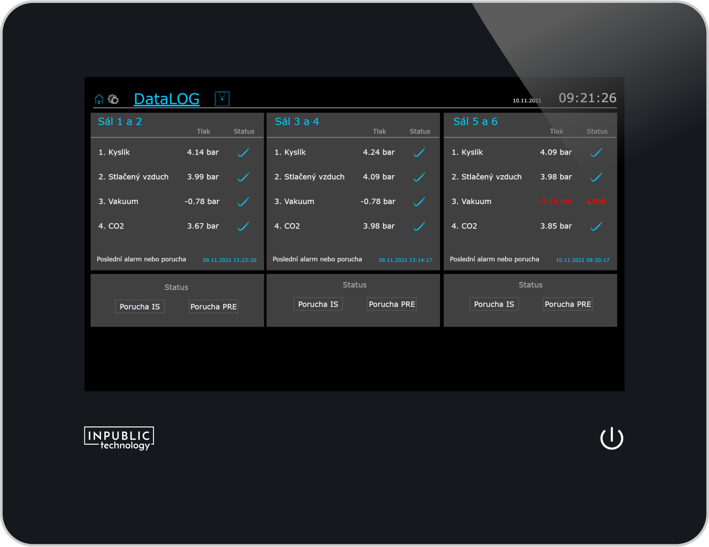 - monitorování hodnot tlaků medicinálních plynů