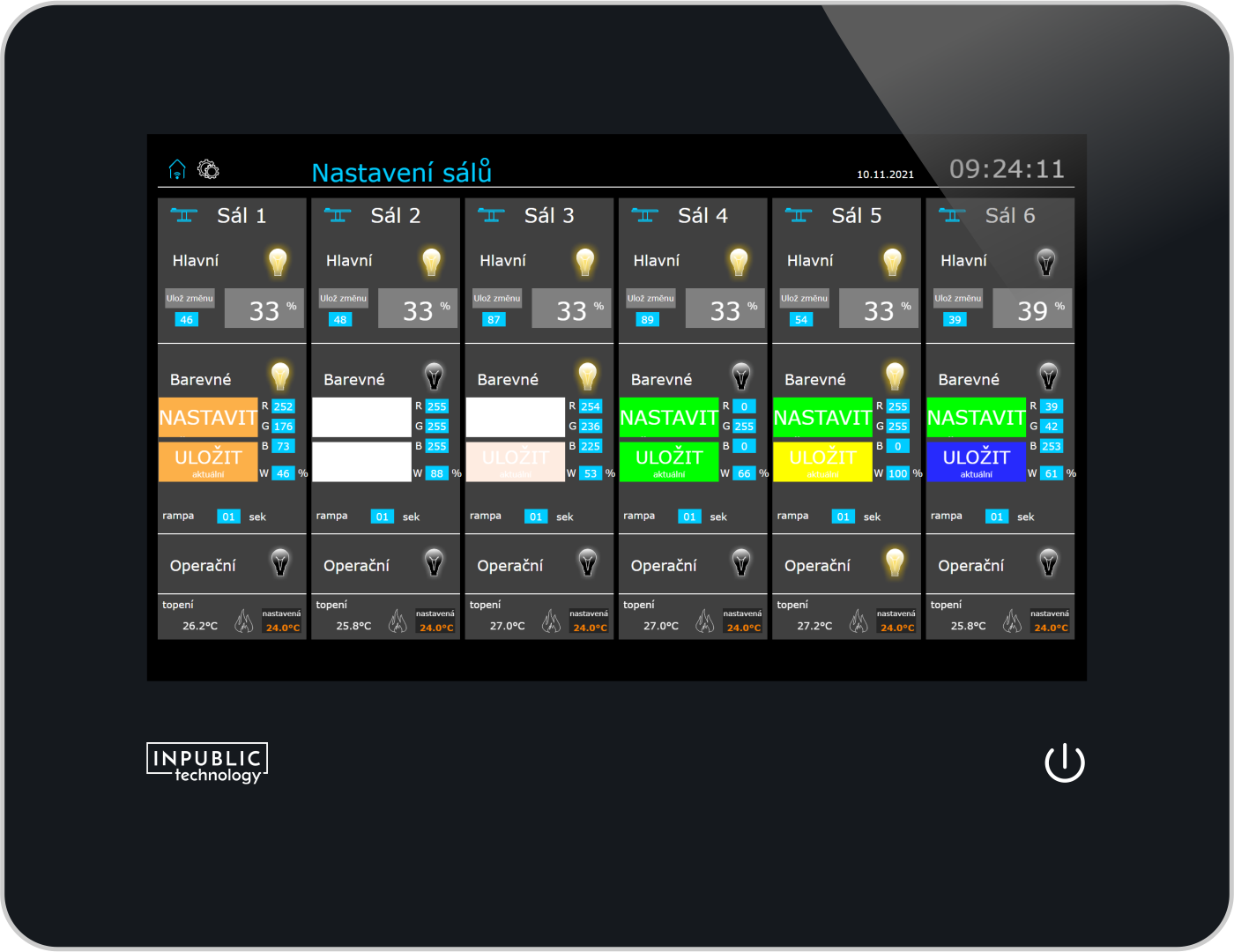 - řízení osvětlení sálů prostřednictvím rozhraní DALI včetně RGBW svítidel a spínání operačních svítidel