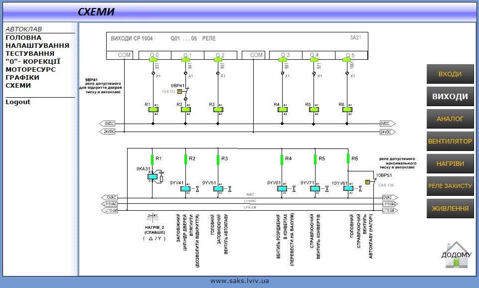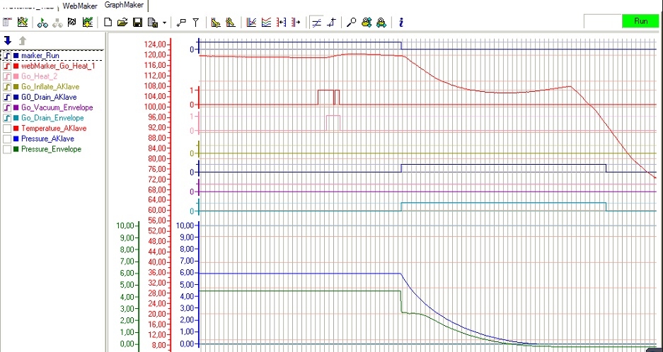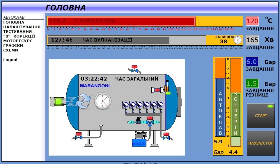 • možnost přechodu na testovací stránku technologie (po zadání hesla) z důvodu kontroly správné funkčnosti řízení v automatické a ručním režimu chodu vulkanizační komory