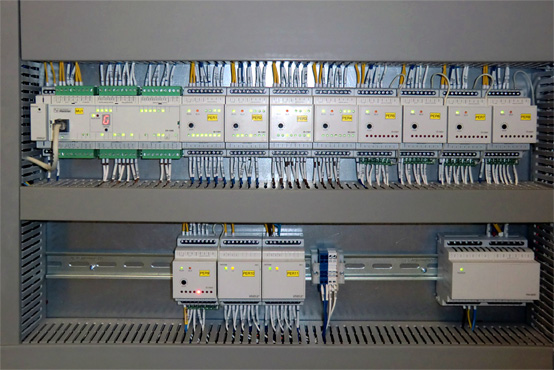 Řídicí systém se skládá ze dvou stanic. První řídicí stanice je nainstalována v rozvodné skříni v místnosti plynové kotelny a stará se o chod technologie plynové kotelny. Druhá řídicí stanice je nainstalována v rozvodné skříni umístěné v technickém mezipatře a stará se o chod chlazení a vzduchotechnických jednotek. Obě stanice spolu komunikují prostřednictvím sítě PLCNet.