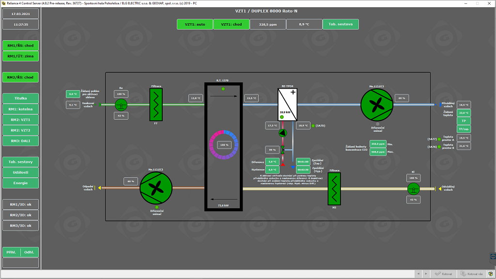 Pro centrálné dohled a řízení je použit dispečerský počítač, který je umístěn v prostoru vrátnice. Na něm je nainstalován SCADA/HMI systém Reliance, jehož úkolem je získávání dat z jednotlivých PLC a jejich zobrazení v přehledných grafických schématech tak, aby obsluha byla okamžitě informována o stavu řízených technických zařízení.