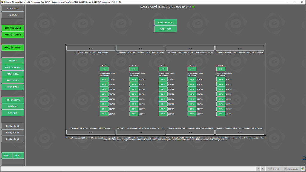 - osvětlení haly prostřednictvím předřadníků DALI (možnost nastavovat scény)