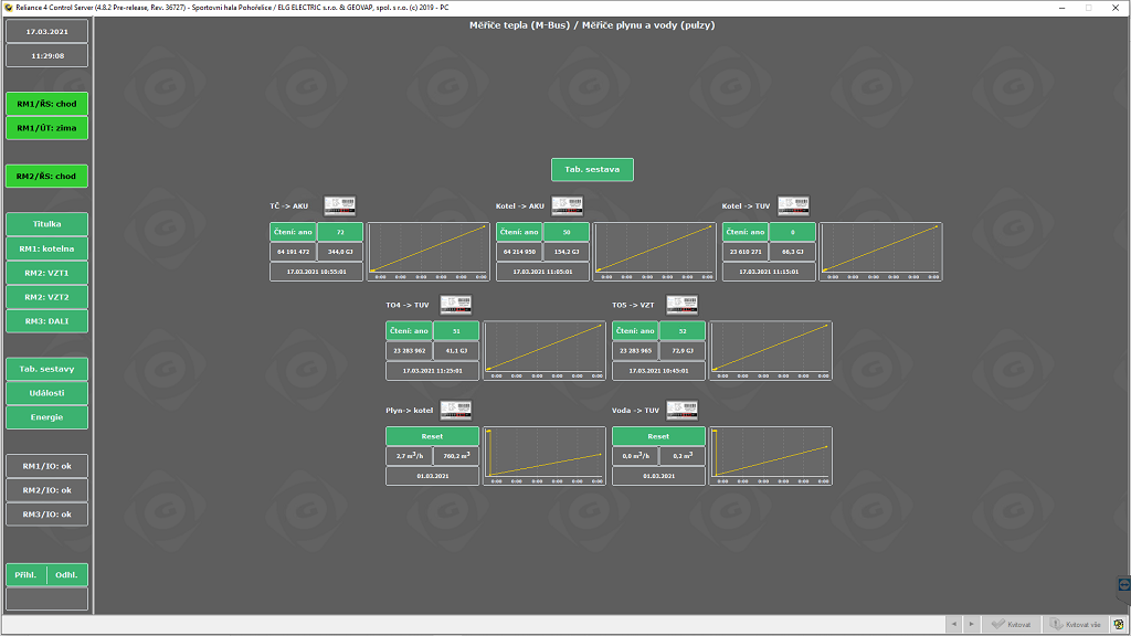 - spotřebu plynu, vody a tepla (komunikace M-Bus)