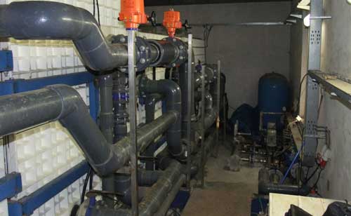 Řídící systém zde sestává z centrální jednotky Foxtrot CP-1005 a příslušných I/O jednotek pro měření veličin (hladin nádrží, tlaků v okruzích čerpadel, apod.) a ovládání (klapek v nádržích, bypassu a systému automatického čištění filtru, apod.)