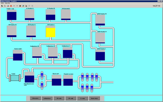 - Řídicí systém: Foxtrot CP-1005 + příslušné I/O jednotky pro měření veličin (hladin nádrží, tlaků v okruzích čerpadel, apod.) a ovládání (klapek v nádržích, bypassu a systému automatického čištění filtru, apod.)
