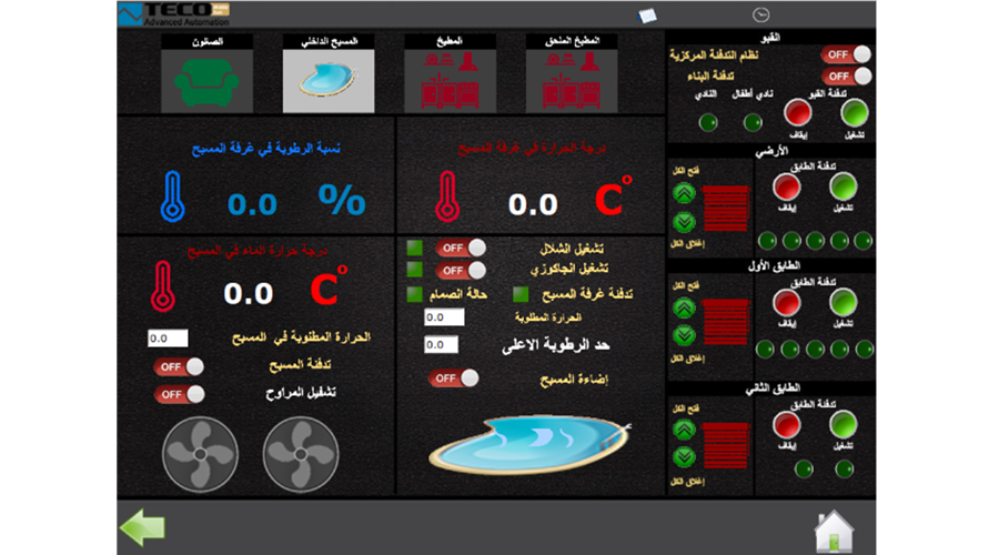 V syrském Damašku se nachází moderní vila disponující 4 podlažími, několika ložnicemi, dvěma velkými salónky, vnitřním a vnějším bazénem a rozlehlou zahradou. Řídicí systém Tecomat Foxtrot řídí v této vile mnoho různých technologií - osvětlení, žaluzie, podlažní topení, ventilaci v garaži a také bazénové technologie.