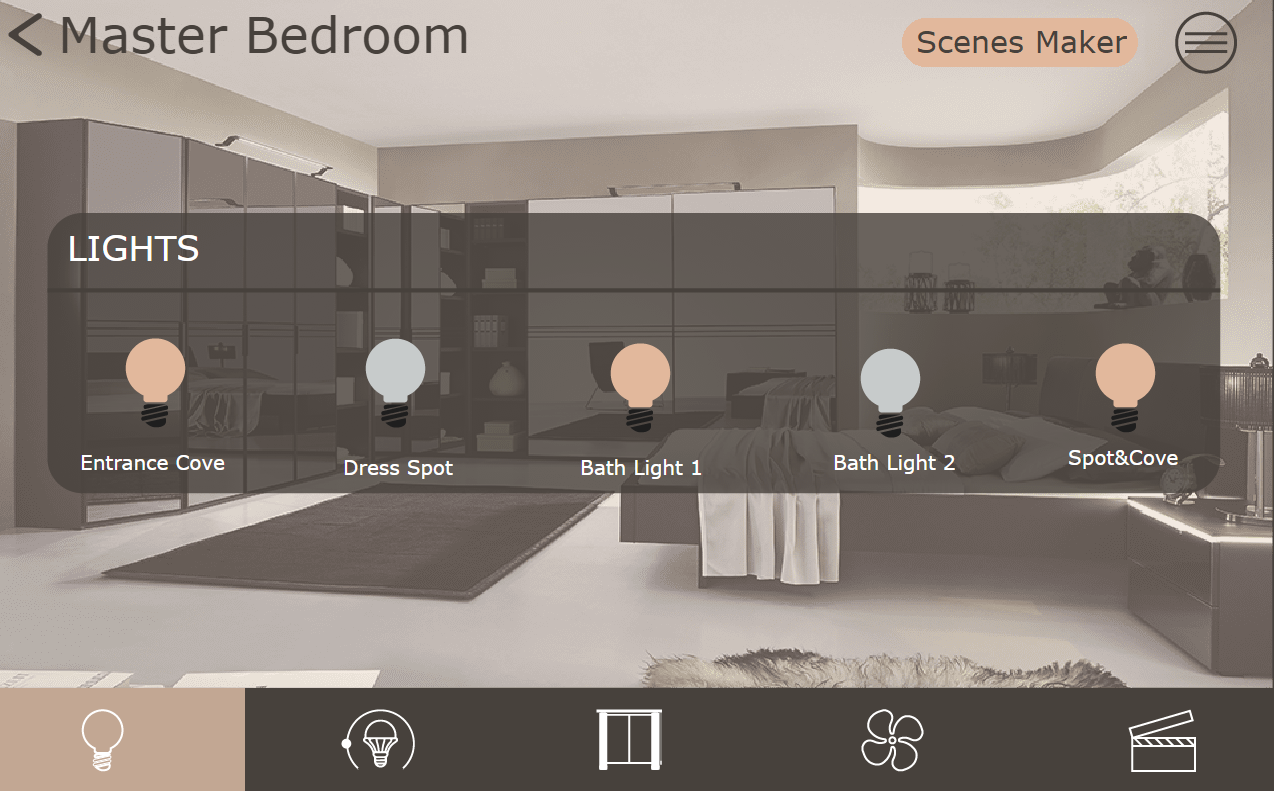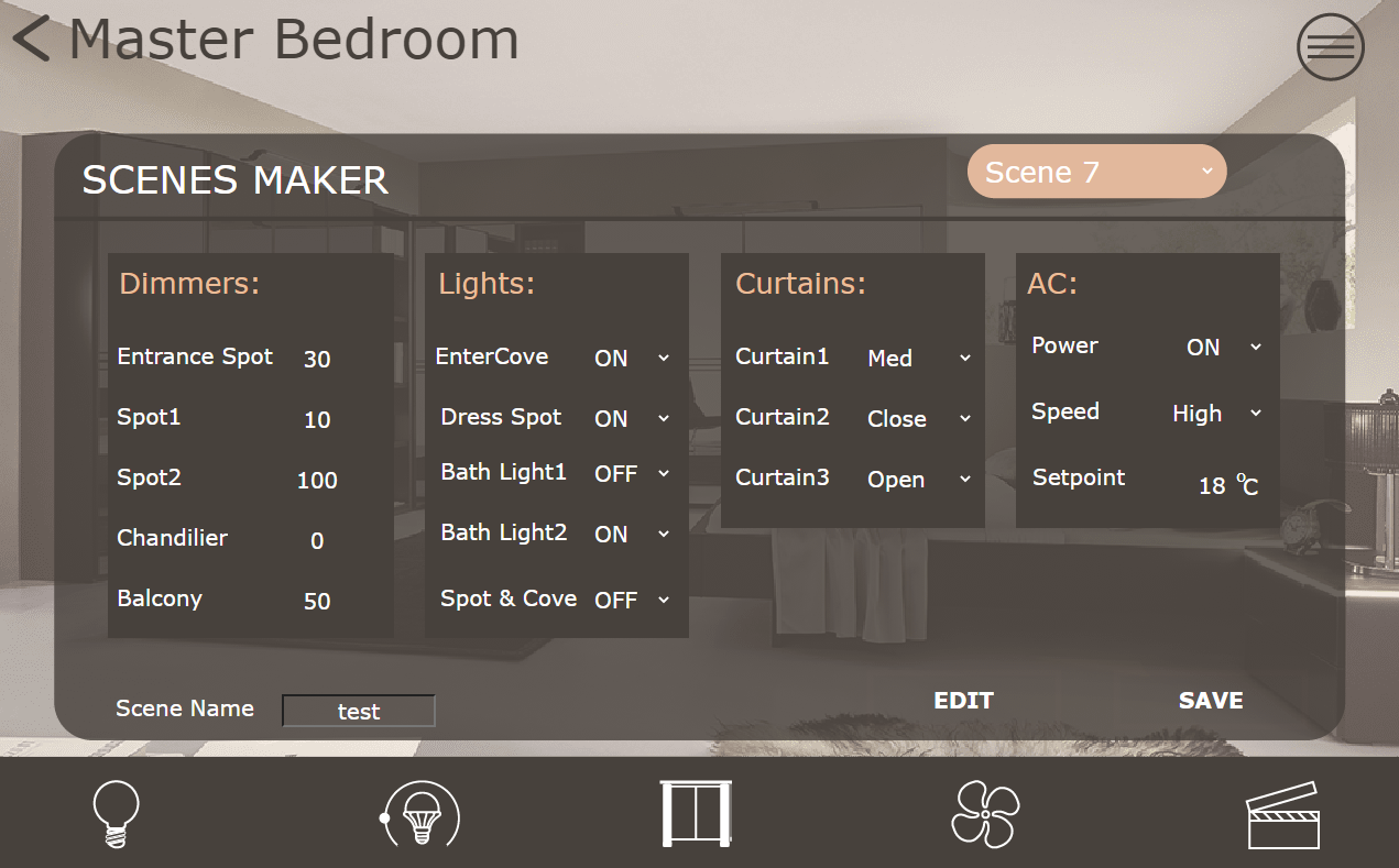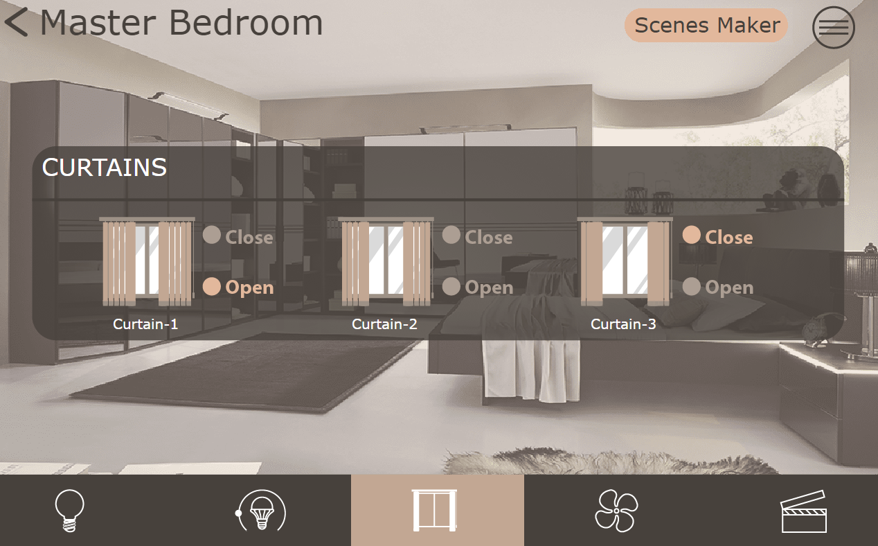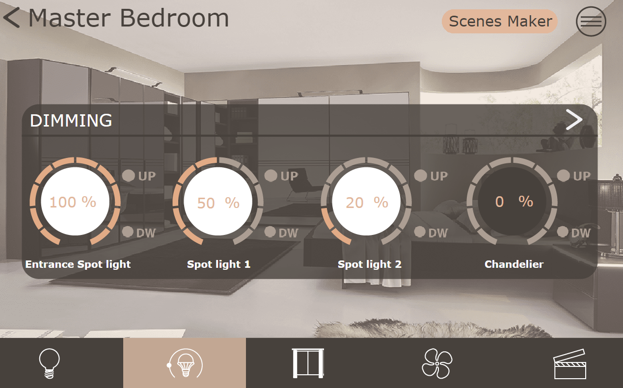 Velmi užitečnou funkcí je možnost nastavit v každé místnosti 4 různé scény a měnit je dle aktuální nálady nebo dle intenzity venkovního světla. Každá z nich disponuje různým nastavením světel, závěsů a klimatizace. I tato funkce dokáže velmi zpříjemnit obyvatelům této chytré domácnosti každodenní život.