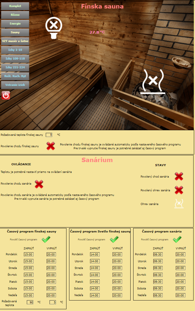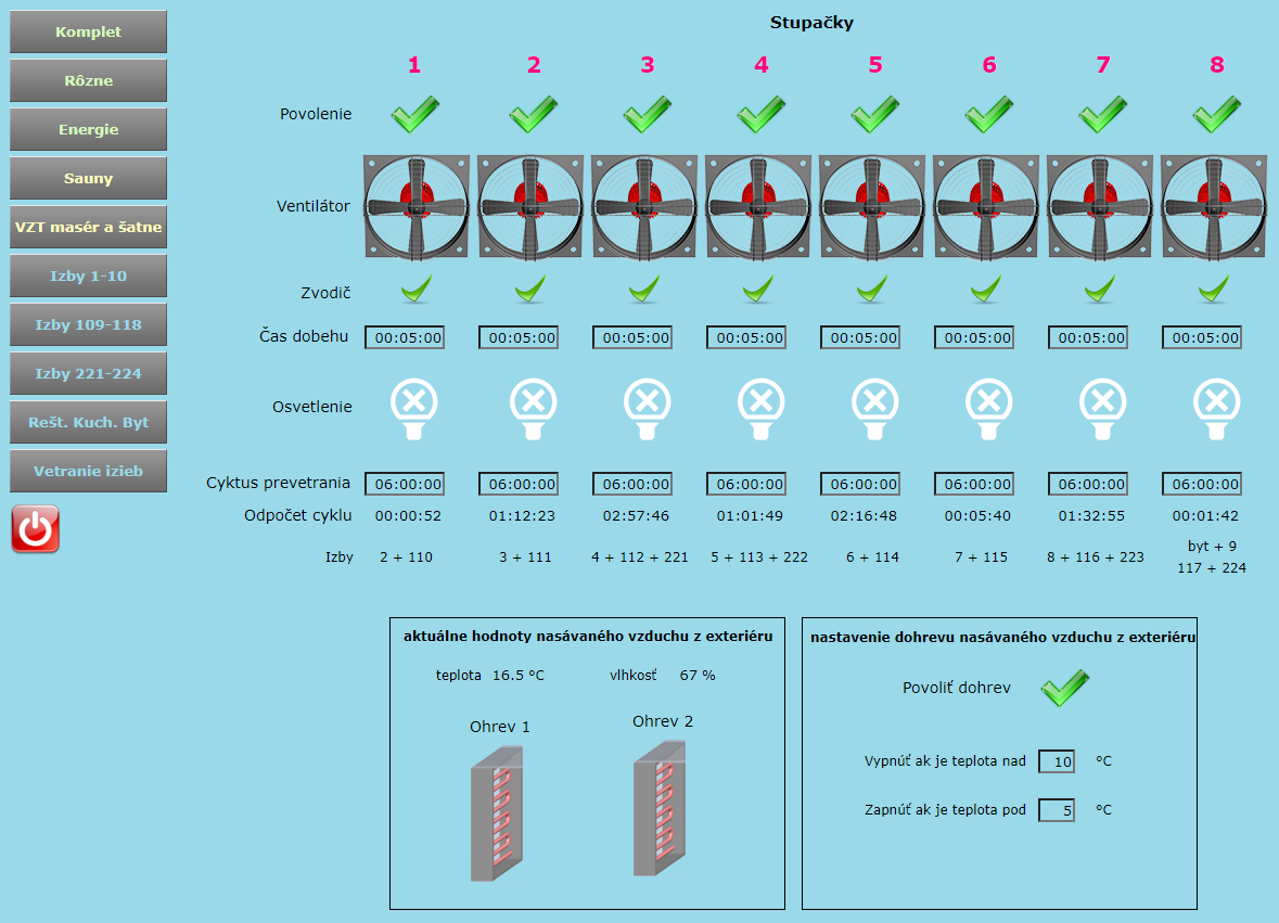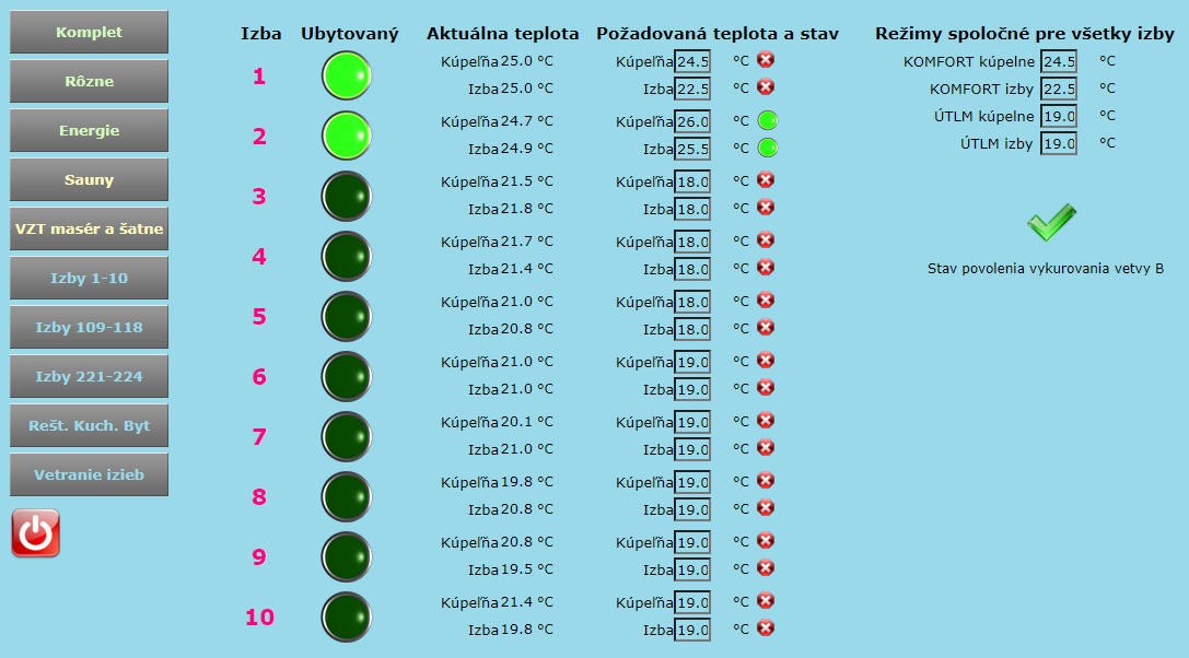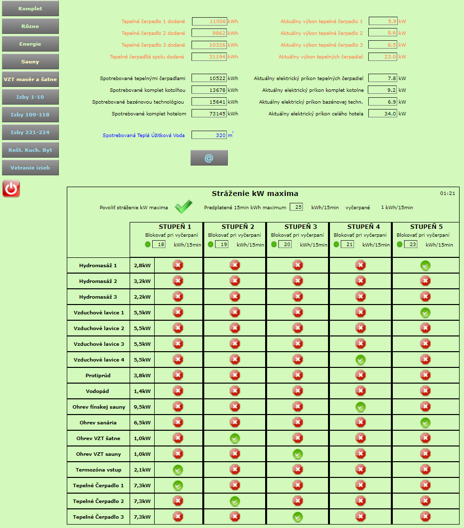 Při návrhu řízení a modernizaci pokojů se přistoupilo také k zónové regulaci. Topení v jednotlivých pokojích je řízeno na základě teploty a obsazenosti – tím se zde dosahuje vyšší efektivity topení a nižší spotřeby energií. Požadovanou teplotu a obsazenost jednotlivých místností zadává personál recepce přes webové rozhraní, které bylo vytvořeno na míru podle požadavků zákazníka. Důležitým požadavkem bylo hlídání čtvrthodinového maxima odběru elektrické energie. Pro měření spotřeby byly použité naše CIB sběrnicové elektroměry C-EM-0401M, které poskytují Foxtrotu hodnoty okamžité spotřeby jednotlivých spotřebičů a okruhů.