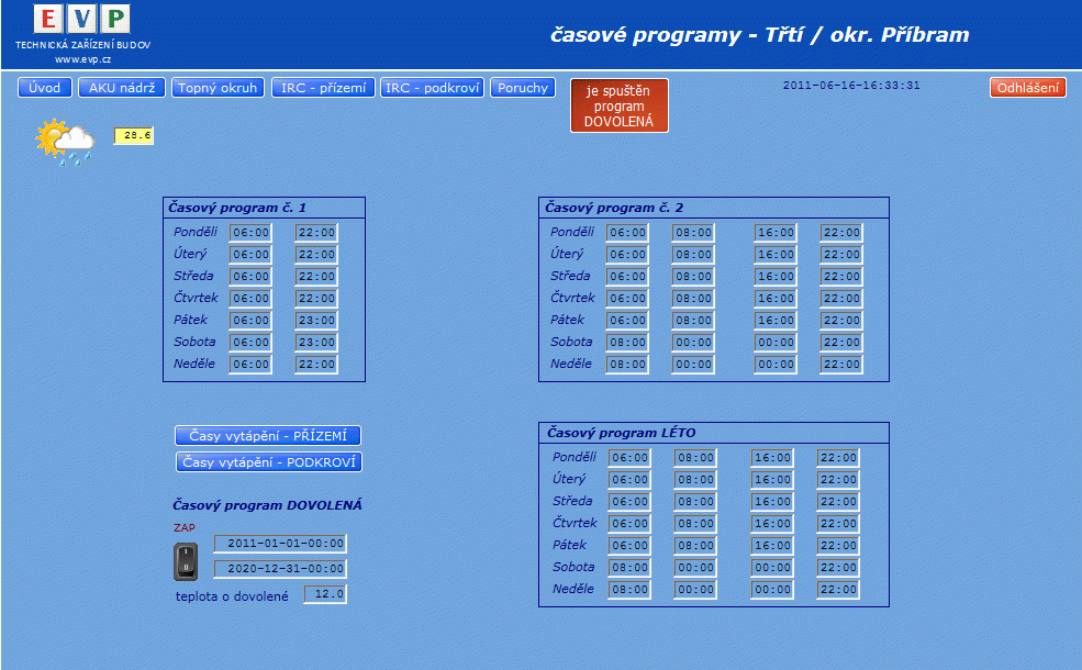 - časový program dovolená (pro vytápění/temperování v době nepřítomnosti)