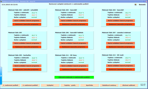 - řízení teplovodního vytápění individuálně v každé místnosti s možností manuálního zásahu do časového programu a nastavení časového programu z vizualizace,