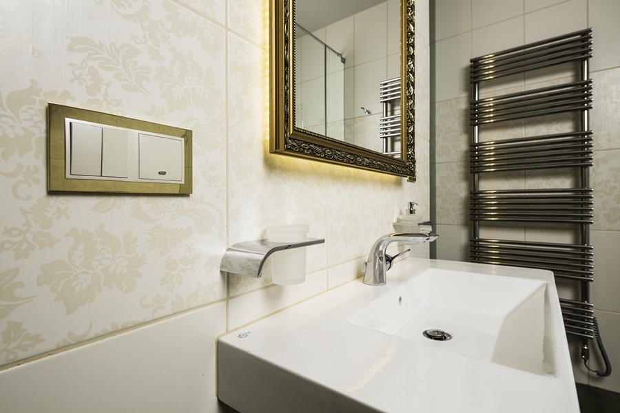 Specialitou je i stmívatelné nasvícení zrcadla, samozřejmostí pak automatické spínání topného žebříku, tísňové tlačítko pro případ pádu uživatele, držák na kartu (centrální zapnutí/vypnutí).