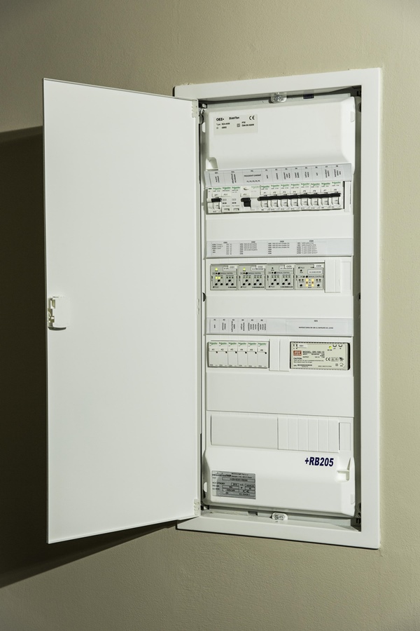 Na stěnách jsou pro ovládání osvětlení umístěny CFox systémové tlačítkové ovladače, které zároveň měří i prostorovou teplotu. Jeden ovladač má i displej, na kterém lze pohodlně nastavovat teplotu v místnosti.