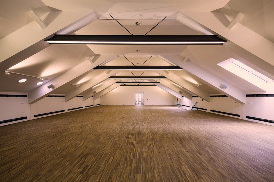 Ve školicím sále dominuje dostatečně intenzivní, přitom však příjemné nepřímé zářivkové osvětlení na střešním krovu a nejsou opomenuty ani bodové lampy nad pracovními plochami.