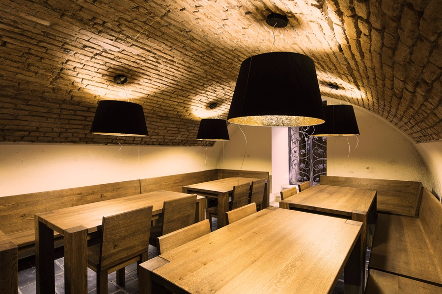 Úplně jiný dojem přináší wellness a fitness v hlavní budově a také sklepní vinárna. Bodová svítidla v úrovni schodů, efektní bodové osvětlení výklenků s režným zdivem, barevné nasvěcování zpoza vinárenských stolů, světelné efekty v sauně či vířivce,… - to vše vytváří neopakovatelnou atmosféru a umocňuje relaxaci či degustační zážitek.