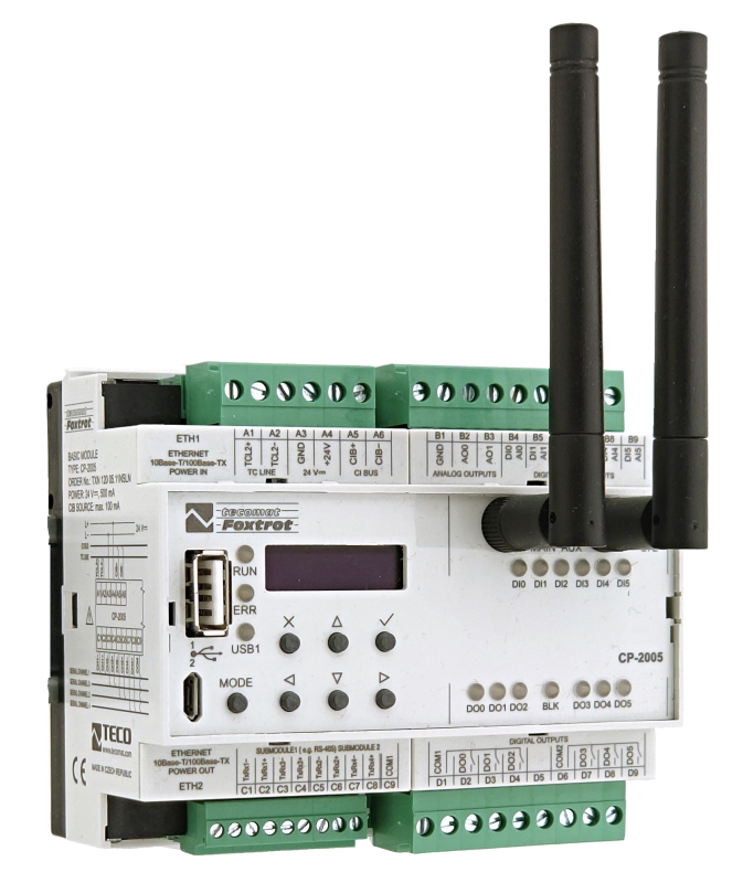 Foxtrot je kompaktní PLC, kde jsou centrála i základní vstupy a výstupy integrovány v jednom těle.